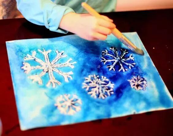 先将美术用的留白液涂在白纸上,画出雪花的形状,再让孩子们用水彩随意的在纸张上挥洒。