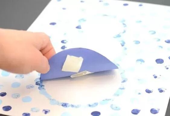 手掌沾染上白色的颜料,然后印到蓝色的卡纸上,换着方向多来几次,一个多边的雪花就出现啦。